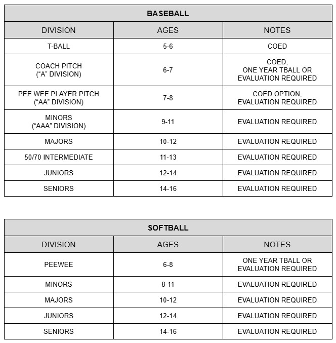 ***Following coach pitch and/or peewee pitch is often where coed teams become less common. Female players typically transition to Minors softball after CP or PW.***